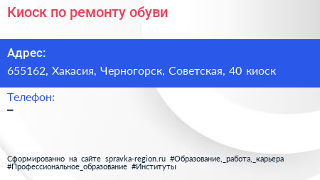 Киоск по ремонту обуви по адресу 655162, Хакасия, Черногорск, Советская, 40 киоск в дальнейшем Организация, размещена в следующих категориях: