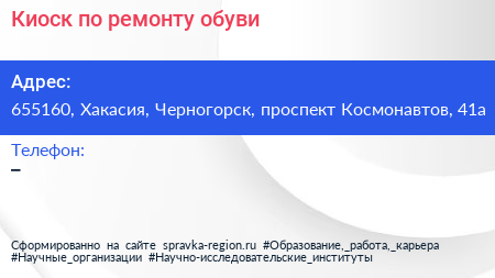 Киоск по ремонту обуви по адресу 655160, Хакасия, Черногорск, проспект Космонавтов, 41а в дальнейшем Организация, размещена в следующих категориях: