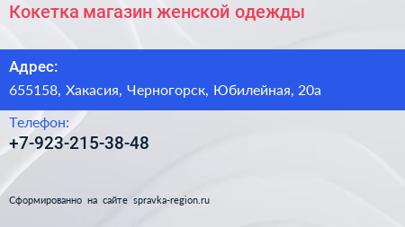 Кокетка, магазин женской одежды по адресу 655158, Хакасия, Черногорск, Юбилейная, 20а в дальнейшем Организация, размещена в следующих категориях: