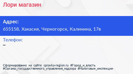 Лори, магазин по адресу 655158, Хакасия, Черногорск, Калинина, 17в в дальнейшем Организация, размещена в следующих категориях: