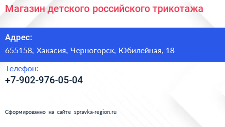 Магазин детского российского трикотажа по адресу 655158, Хакасия, Черногорск, Юбилейная, 18 в дальнейшем Организация, размещена в следующих категориях: