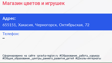 Магазин цветов и игрушек по адресу 655151, Хакасия, Черногорск, Октябрьская, 72 в дальнейшем Организация, размещена в следующих категориях:
