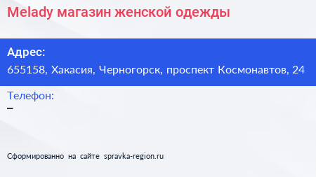 Melady, магазин женской одежды по адресу 655158, Хакасия, Черногорск, проспект Космонавтов, 24 в дальнейшем Организация, размещена в следующих категориях:
