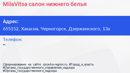 MilaVitsa, салон нижнего белья по адресу 655152, Хакасия, Черногорск, Дзержинского, 13а в дальнейшем Организация, размещена в следующих категориях: