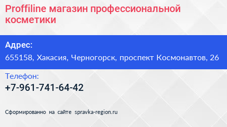 Proffiline, магазин профессиональной косметики по адресу 655158, Хакасия, Черногорск, проспект Космонавтов, 26 в дальнейшем Организация, размещена в следующих категориях: