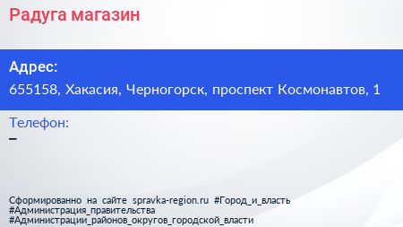 Радуга, магазин по адресу 655158, Хакасия, Черногорск, проспект Космонавтов, 1 в дальнейшем Организация, размещена в следующих категориях: