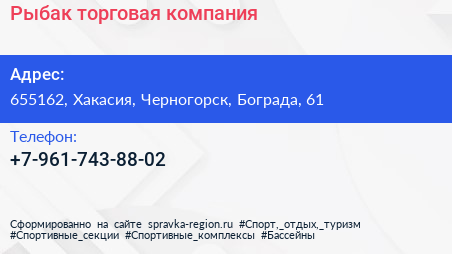 Рыбак, торговая компания по адресу 655162, Хакасия, Черногорск, Бограда, 61 в дальнейшем Организация, размещена в следующих категориях: