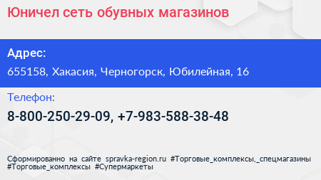 Юничел, сеть обувных магазинов по адресу 655158, Хакасия, Черногорск, Юбилейная, 16 в дальнейшем Организация, размещена в следующих категориях:
