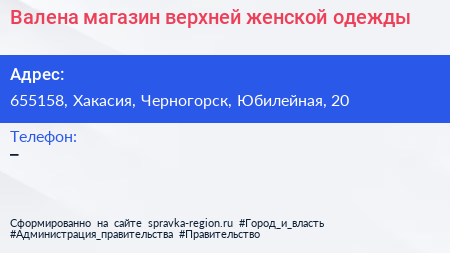 Валена, магазин верхней женской одежды по адресу 655158, Хакасия, Черногорск, Юбилейная, 20 в дальнейшем Организация, размещена в следующих категориях: