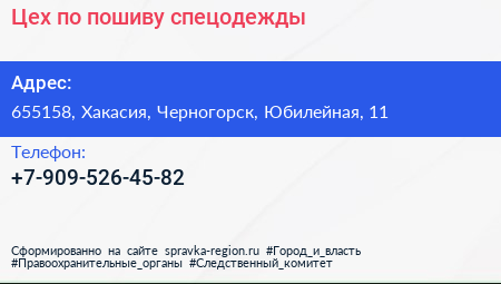 Цех по пошиву спецодежды по адресу 655158, Хакасия, Черногорск, Юбилейная, 11 в дальнейшем Организация, размещена в следующих категориях: