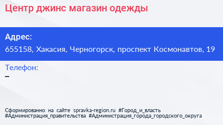 Центр джинс, магазин одежды по адресу 655158, Хакасия, Черногорск, проспект Космонавтов, 19 в дальнейшем Организация, размещена в следующих категориях: