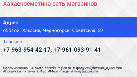 Хакаскосметика, сеть магазинов по адресу 655162, Хакасия, Черногорск, Советская, 37 в дальнейшем Организация, размещена в следующих категориях: