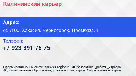 Калининский карьер по адресу 655100, Хакасия, Черногорск, Промбаза, 1 в дальнейшем Организация, размещена в следующих категориях: