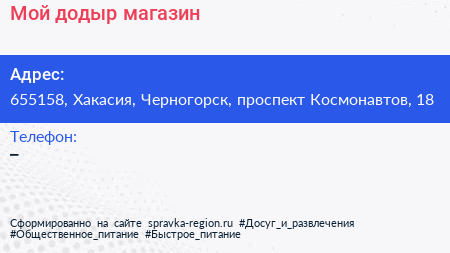 Мой додыр, магазин по адресу 655158, Хакасия, Черногорск, проспект Космонавтов, 18 в дальнейшем Организация, размещена в следующих категориях: