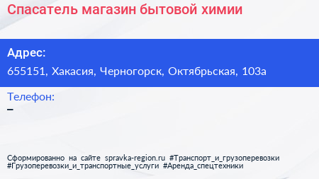 Спасатель, магазин бытовой химии по адресу 655151, Хакасия, Черногорск, Октябрьская, 103а в дальнейшем Организация, размещена в следующих категориях: