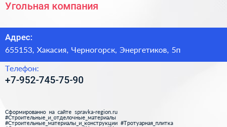 Угольная компания по адресу 655153, Хакасия, Черногорск, Энергетиков, 5п в дальнейшем Организация, размещена в следующих категориях: