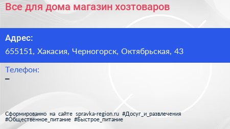 Все для дома, магазин хозтоваров по адресу 655151, Хакасия, Черногорск, Октябрьская, 43 в дальнейшем Организация, размещена в следующих категориях: