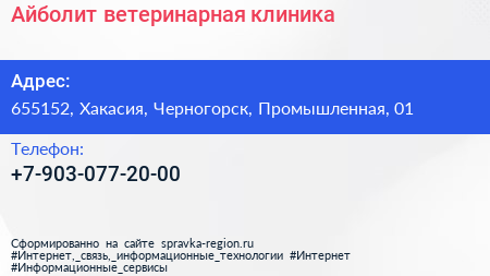 Айболит, ветеринарная клиника по адресу 655152, Хакасия, Черногорск, Промышленная, 01 в дальнейшем Организация, размещена в следующих категориях: