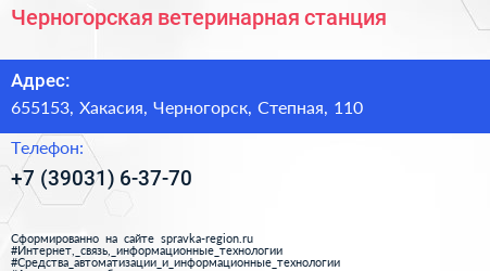 Черногорская ветеринарная станция по адресу 655153, Хакасия, Черногорск, Степная, 110 в дальнейшем Организация, размещена в следующих категориях: