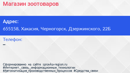 Магазин зоотоваров по адресу 655158, Хакасия, Черногорск, Дзержинского, 22Б в дальнейшем Организация, размещена в следующих категориях:
