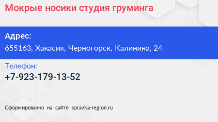 Мокрые носики, студия груминга по адресу 655163, Хакасия, Черногорск, Калинина, 24 в дальнейшем Организация, размещена в следующих категориях: