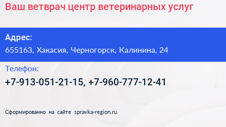 Ваш ветврач, центр ветеринарных услуг по адресу 655163, Хакасия, Черногорск, Калинина, 24 в дальнейшем Организация, размещена в следующих категориях: