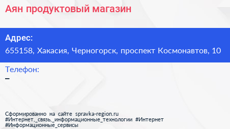Аян, продуктовый магазин по адресу 655158, Хакасия, Черногорск, проспект Космонавтов, 10 в дальнейшем Организация, размещена в следующих категориях: