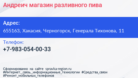 Андреич, магазин разливного пива по адресу 655163, Хакасия, Черногорск, Генерала Тихонова, 11 в дальнейшем Организация, размещена в следующих категориях:
