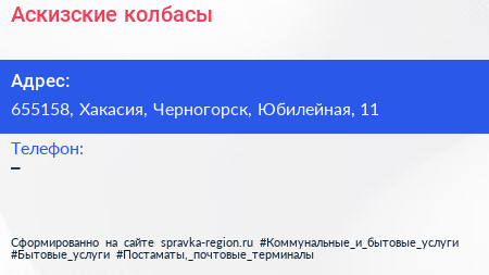 Аскизские колбасы по адресу 655158, Хакасия, Черногорск, Юбилейная, 11 в дальнейшем Организация, размещена в следующих категориях: