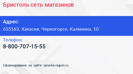Бристоль, сеть магазинов по адресу 655163, Хакасия, Черногорск, Калинина, 10 в дальнейшем Организация, размещена в следующих категориях: