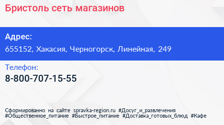 Бристоль, сеть магазинов по адресу 655152, Хакасия, Черногорск, Линейная, 249 в дальнейшем Организация, размещена в следующих категориях: