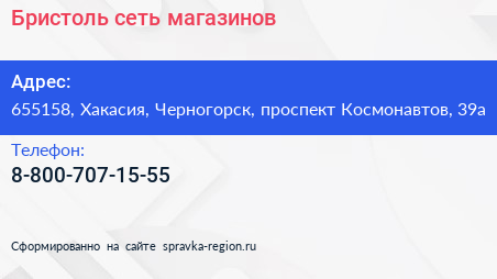 Бристоль, сеть магазинов по адресу 655158, Хакасия, Черногорск, проспект Космонавтов, 39а в дальнейшем Организация, размещена в следующих категориях: