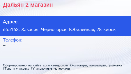 Дальян 2, магазин по адресу 655163, Хакасия, Черногорск, Юбилейная, 28 киоск в дальнейшем Организация, размещена в следующих категориях: