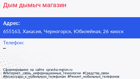 Дым дымыч, магазин по адресу 655163, Хакасия, Черногорск, Юбилейная, 26 киоск в дальнейшем Организация, размещена в следующих категориях:
