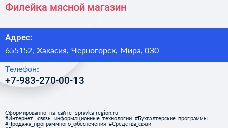 Филейка, мясной магазин по адресу 655152, Хакасия, Черногорск, Мира, 030 в дальнейшем Организация, размещена в следующих категориях: