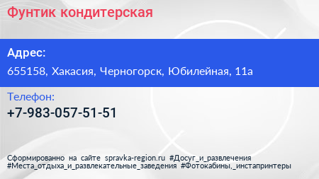 Фунтик, кондитерская по адресу 655158, Хакасия, Черногорск, Юбилейная, 11а в дальнейшем Организация, размещена в следующих категориях: