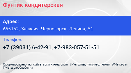 Фунтик, кондитерская по адресу 655162, Хакасия, Черногорск, Ленина, 51 в дальнейшем Организация, размещена в следующих категориях: