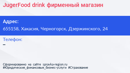 JugerFood & drink, фирменный магазин по адресу 655158, Хакасия, Черногорск, Дзержинского, 24 в дальнейшем Организация, размещена в следующих категориях: