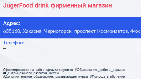 JugerFood & drink, фирменный магазин по адресу 655160, Хакасия, Черногорск, проспект Космонавтов, 44ж в дальнейшем Организация, размещена в следующих категориях: