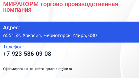 МИРАКОРМ, торгово-производственная компания по адресу 655152, Хакасия, Черногорск, Мира, 030 в дальнейшем Организация, размещена в следующих категориях: