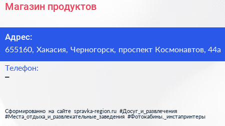 Магазин продуктов по адресу 655160, Хакасия, Черногорск, проспект Космонавтов, 44а в дальнейшем Организация, размещена в следующих категориях: