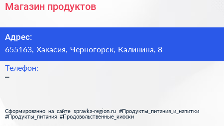 Магазин продуктов по адресу 655163, Хакасия, Черногорск, Калинина, 8 в дальнейшем Организация, размещена в следующих категориях: