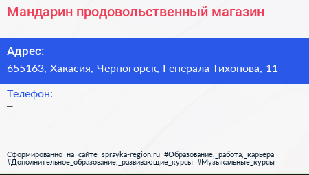 Мандарин, продовольственный магазин по адресу 655163, Хакасия, Черногорск, Генерала Тихонова, 11 в дальнейшем Организация, размещена в следующих категориях: