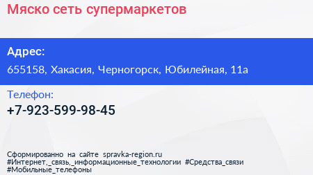 Мяско, сеть супермаркетов по адресу 655158, Хакасия, Черногорск, Юбилейная, 11а в дальнейшем Организация, размещена в следующих категориях: