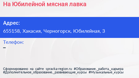 На Юбилейной, мясная лавка по адресу 655158, Хакасия, Черногорск, Юбилейная, 3 в дальнейшем Организация, размещена в следующих категориях: