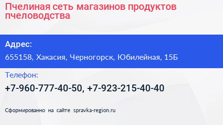 Пчелиная, сеть магазинов продуктов пчеловодства по адресу 655158, Хакасия, Черногорск, Юбилейная, 15Б в дальнейшем Организация, размещена в следующих категориях:
