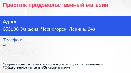 Престиж, продовольственный магазин по адресу 655138, Хакасия, Черногорск, Ленина, 24а в дальнейшем Организация, размещена в следующих категориях: