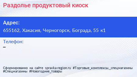 Раздолье, продуктовый киоск по адресу 655162, Хакасия, Черногорск, Бограда, 55 к1 в дальнейшем Организация, размещена в следующих категориях: