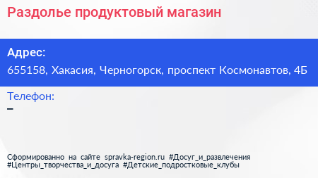 Раздолье, продуктовый магазин по адресу 655158, Хакасия, Черногорск, проспект Космонавтов, 4Б в дальнейшем Организация, размещена в следующих категориях: