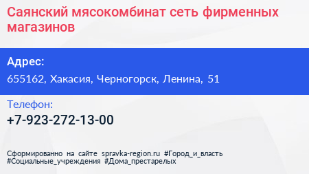 Саянский мясокомбинат, сеть фирменных магазинов по адресу 655162, Хакасия, Черногорск, Ленина, 51 в дальнейшем Организация, размещена в следующих категориях: